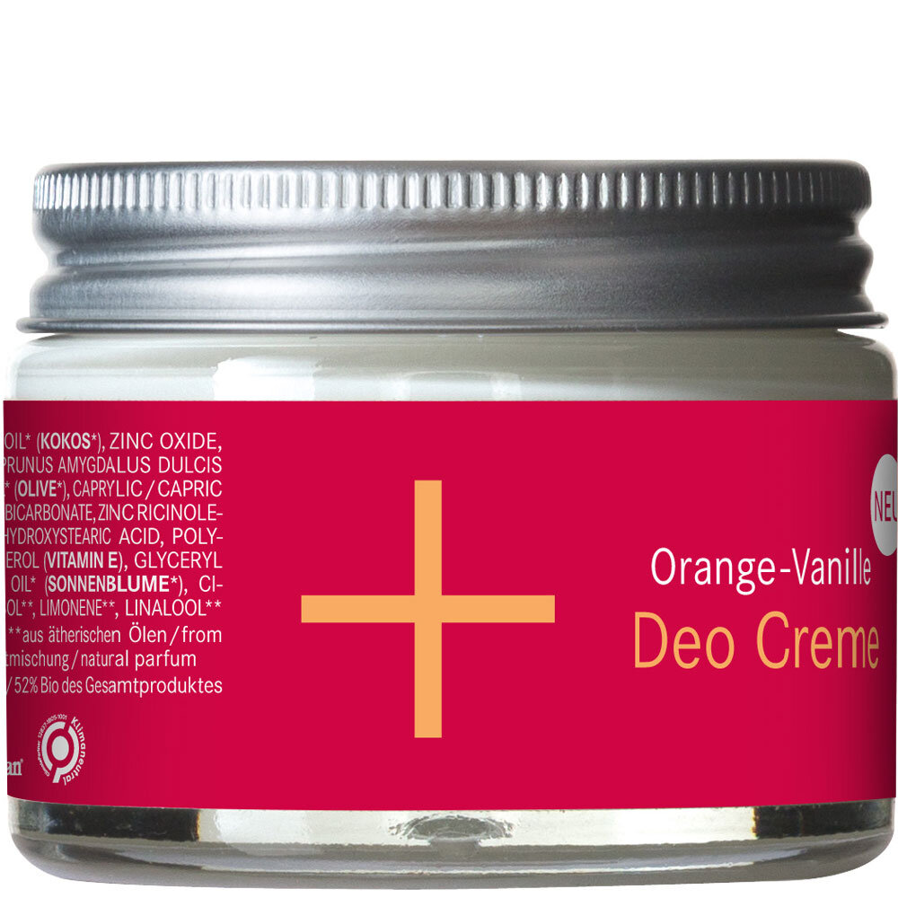 Thanks to its natural deodorant formula of coconut, baking soda and zinc, Orange Vanilla Deodorant Cream provides indispensable immediate protection against unpleasant underarm odour for many hours. Anti-irritant zinc oxide soothes the sensitive underarm area – especially enjoyable after shaving. Fair-trade almond and olive oil leave the skin velvety soft. Vitamin E nourishes and smoothes the underarm skin.