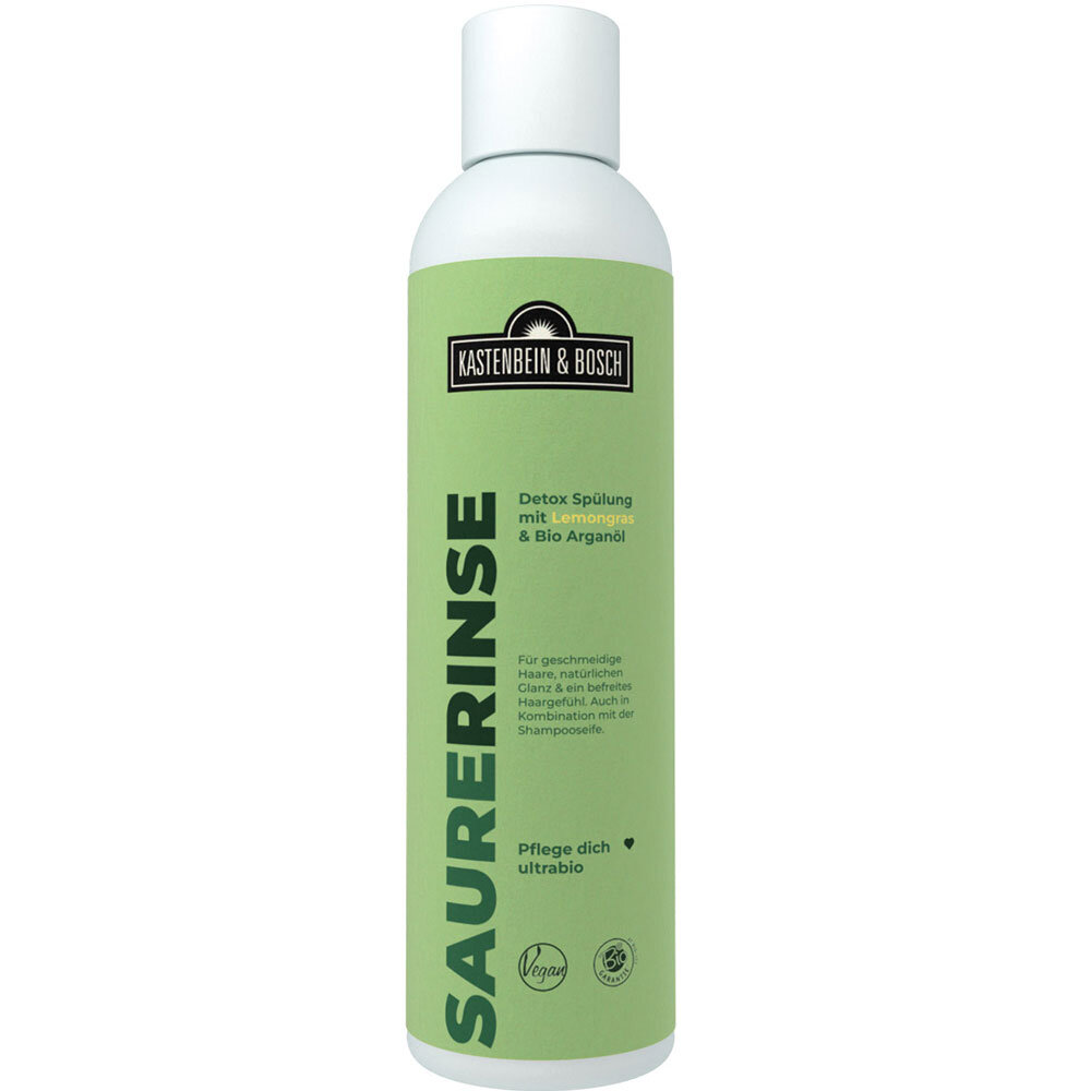 Unsere Saure Rinse wirkt vollkommen natürlich; mit ihrem niedrigen pH-Wert überzeugt sie vor allem in Kombination mit einer Haarseife – wie z. B. unserer Kastenbein & Bosch Shampoo-Seife: Während letztere mit ihrer basischen Zusammensetzung die Haarstruktur öffnet, damit das Haar von Schmutz und sonstigen Ablagerungen befreit wird, schließt unsere Saure Rinse die Schuppenschicht wieder, nachdem sie das Haar mit wertvollen Ölen und Chia Extrakt genährt hat. In einem unvergleichbaren Teamwork sorgt unsere Saure Rinse also dafür, dass dein Haar wieder glänzt und nur so vor Vitalität strotzt.