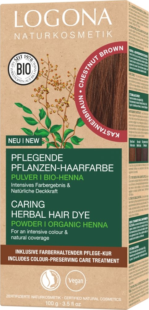 The chestnut brown nuance is particularly suitable for medium-blonde to medium-brown hair. The herbal hair colours are especially gentle and lasting. In contrast to chemical hair dyes, they do not intervene with the natural structure of hair. The herbal hair colour covers every hair like a film. As a result, the original hair colour also determines the individual dye result. A composition of organic henna powder* and other colouring plants, in addition to caring botanical ingredients like organic jojoba oil*, provides radiant colour, shine and volume.