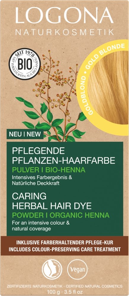 The gold-blonde nuance is particularly suitable for light- to medium-blonde hair. The herbal hair colours are especially gentle and lasting. In contrast to chemical hair dyes, they do not intervene with the natural structure of hair. The herbal hair colour covers every hair like a film. As a result, the original hair colour also determines the individual dye result. A composition of organic henna powder* and other colouring plants, in addition to caring botanical ingredients like organic jojoba oil*, provides radiant colour, shine and volume.