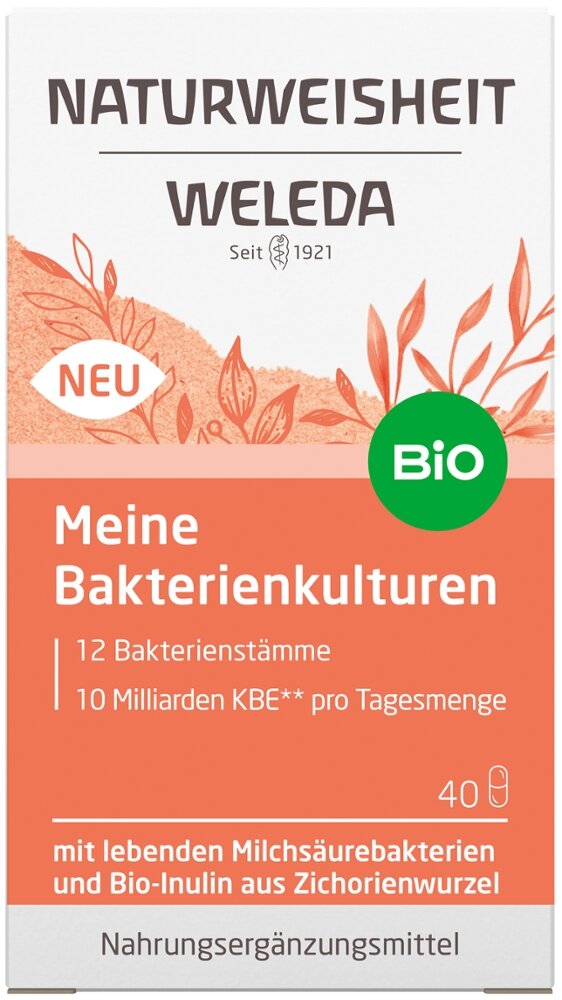 At the recommended daily dose, the food supplement capsules by Weleda provide 10 billion colony-forming units (CFU) from lactic acid bacteria and inulin, a polysaccharide obtained from chicory roots. The capsules can be taken at any time as needed, even on the go.
