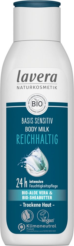 Die basis sensitiv Body Milk Reichhaltig mit Bio-Aloe Vera & Bio-Sheabutter bietet 24 Stunden intensive Feuchtigkeitspflege für trockene Haut.