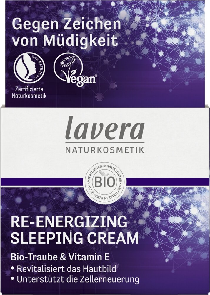 Neue Energie über Nacht: Während wir schlafen, arbeiten unsere Hautzellen auf Hochtouren, um die Schäden des Tages zu reparieren. Die lavera Re-Energizing Sleeping Cream unterstützt die Zellerneuerung und bekämpft Zeichen von Müdigkeit. Die umhüllende Textur verleiht intensive Feuchtigkeit für eine pralle, frische Haut am Morgen.