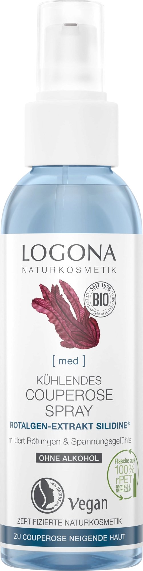 Das kühlende LOGONA COUPEROSE SPRAY beruhigt die Haut und schafft schnelle Linderung bei Spannungsgefühlen – auch für unterwegs. Das feuchtigkeitsspendende Spray mit dem exklusiven Wirkstoff SILIDINE® aus der Rotalge stärkt die Gefäßwände, erhöht ihre Spannkraft und lindert Rötungen langanhaltend. Besonders sanft. Ohne Alkohol.