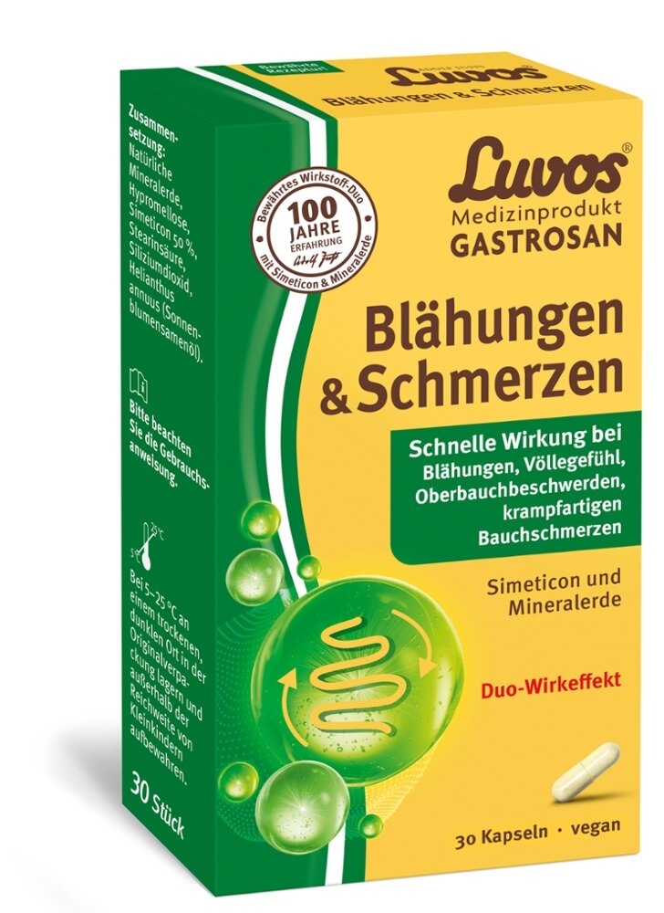 Luvos-Gastrosan Blähungen & Schmerzen ist ein Medizinprodukt, das verwendet wird zur symptomatischen Behandlung von Bauchschmerzen und -beschwerden, Druckgefu?hl im Bauchraum, Aufstoßen und Blähungen bei Erwachsenen und Kindern ab 12 Jahren.