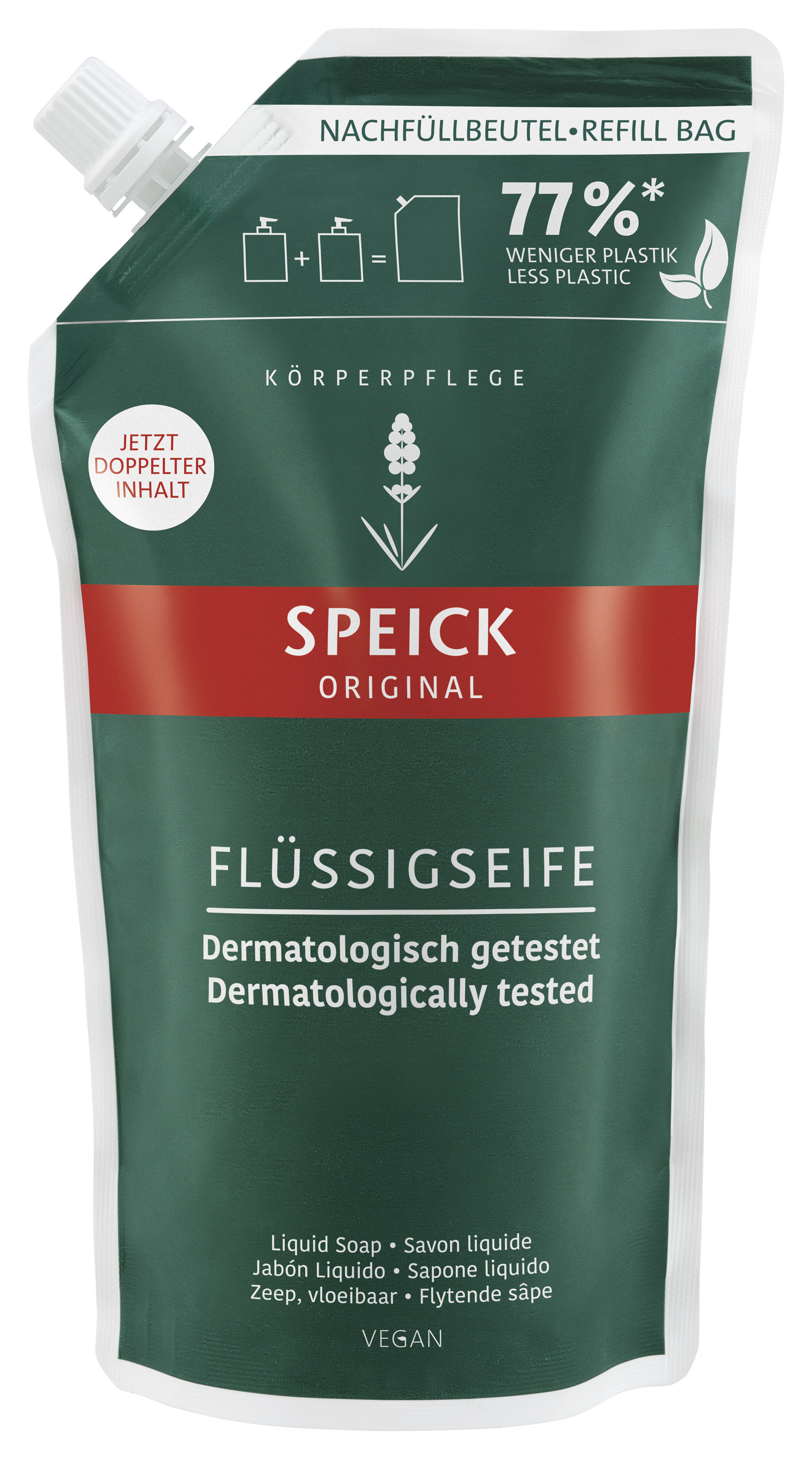 Enthärtetes Wasser, Waschrohstoff, Waschrohstoff (pflanzliche Basis), Kochsalz, Rückfettungskomponente (pflanzliche Basis), Waschrohstoff (Zuckerbasis), Multifunktioneller Milchsäureester, Speick-Pflanzenextrakt (Pflanze aus kontrolliert biologischer Wildsammlung), Lavendel-Öl, Provitamin B5, Komposition mit ätherischen Ölen, Mineralsalz, Zitronensäure, Salz der Benzoesäure (Konservierung), Salz der Sorbinsäure (Konservierung), Komponente ätherisches Öl