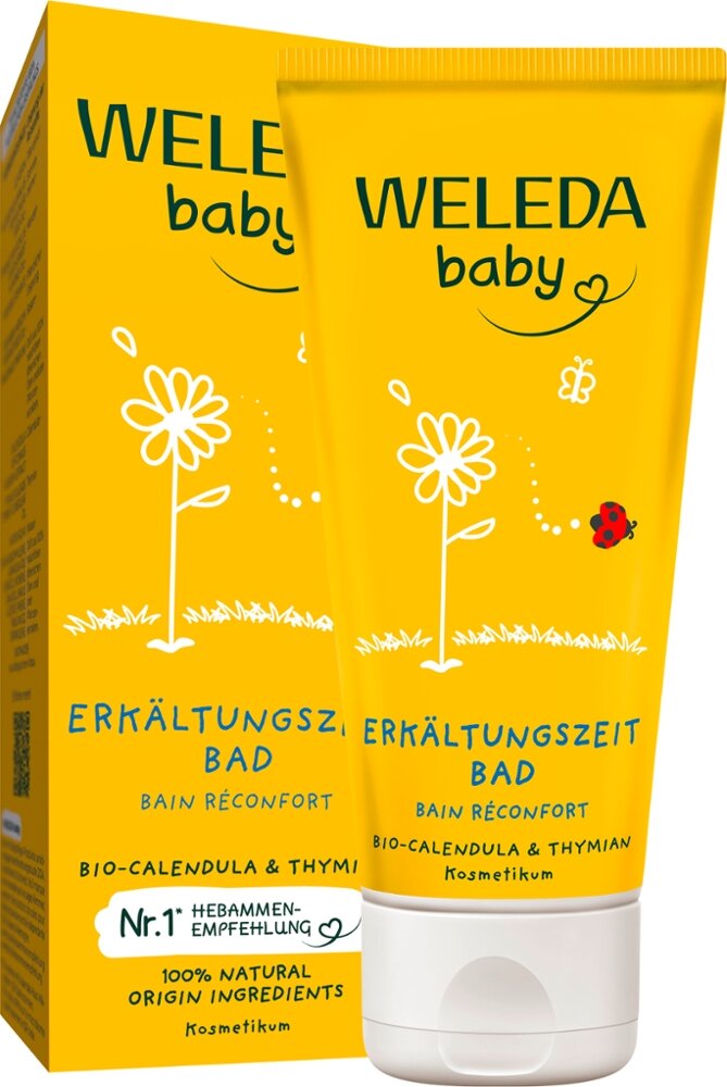 Schenke deinem Baby in der kälteren Jahreszeit wohlige Geborgenheit mit dem Calendula Erkältungszeit Bad von Weleda Baby! Das Baden mit dem Erkältungszeit Bad entspannt und pflegt die Haut – seine extra milde Formel reinigt die Haut besonders sanft. Im durchwärmenden Bad entfaltet die Mischung mit Thymian, Latschenkiefer und Lavendel ihren wohltuenden Duft. Geeignet für Babys ab 3 Monaten.