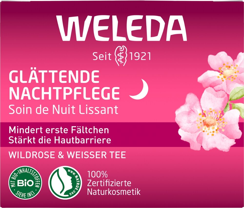 Die Glättende Nachtpflege Wildrose & Weißer Tee schenkt der Haut über Nacht Erholung. Sie stärkt die Hautbarriere und spendet langanhaltende Feuchtigkeit. Das Ergebnis ist sichtbar glattere Haut und ein frisches, erholtes Aussehen am Morgen. Der Age-Protect-Complex mit Bio-Wildrosenöl und antioxidativem Weißem Tee schützt wirksam vor den ersten Anzeichen der Hautalterung.